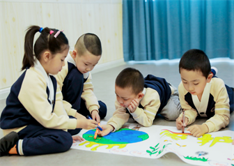 孩子们用手中的画笔描绘各自心中的“地球”,对美丽大自然的憧憬,先打底,在描边,最后上色。孩子们神情专注地在画卷上描描点点,纸张与指尖的温度仿佛融入在一起,手中的画在橘色的暖光中嬉戏。在小朋友的共同努力下,呈现了一幅生动有趣的画卷。孩子们用绘画的形式向同学倡议、向家长倡议,向身边所有的人倡议:要爱护地球,节约资源,减少污染,保护自然,万物共存。爱护地球,保护环境,从小事做起,从你我做起。